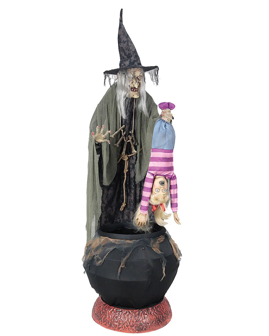 Der gemeine Hexe Animatronic mit Kind weist eine Größe von ca. 203 x 101 x 114 cm auf und wird elektronisch betrieben. Die Albtraumgestalt für Walpurgisnacht ist hochwertig verarbeitet und entspricht optisch einer Märchenhexe wie sie im Buche steht mit großer Nase, gebogenem Kinn, Spitzhut und langen, verfilzten Haaren. Schaurige Leuchteffekte in giftigem Grün im Kessel sowie leuchtend weiße Augen untermalen die bösen, in englischer Sprache gehaltenen Sätze der Halloween-Dekoration, während das zappelnde und wie am Spieß schreiende Kind verzweifelt versucht, sich aus dem Griff der Halloween-Hexe zu befreien. Die Halloween-Figur lässt sich mittels Bewegungsmelder, beiliegender Fußmatte oder in Dauerschleife betreiben; ein Adapter für deutsche Steckdosen ist im Lieferumfang enthalten. Weitere Halloween-Animatronics wie den Hängefigur Dracula Animatronic 90cm und den Fetzen Reaper Todesengel Animatronic 230 cm findest du ebenfalls bei uns im Karneval-Universe.de!