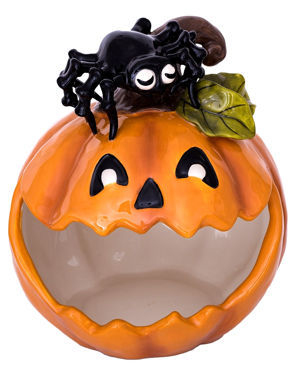 Unsere grinsender Kürbis Keramik Süßigkeiten Schale wird der Blickfang auf jedem Halloween Buffet sein. Am Strunk der Halloween Keksdose sitzt eine niedliche Spinne, die dich mit zuckersüßen Augen anblickt. Aber täusch dich nicht, die kleine Spinne behütet den Inhalt vor kleinen Süßigkeiten Monstern.