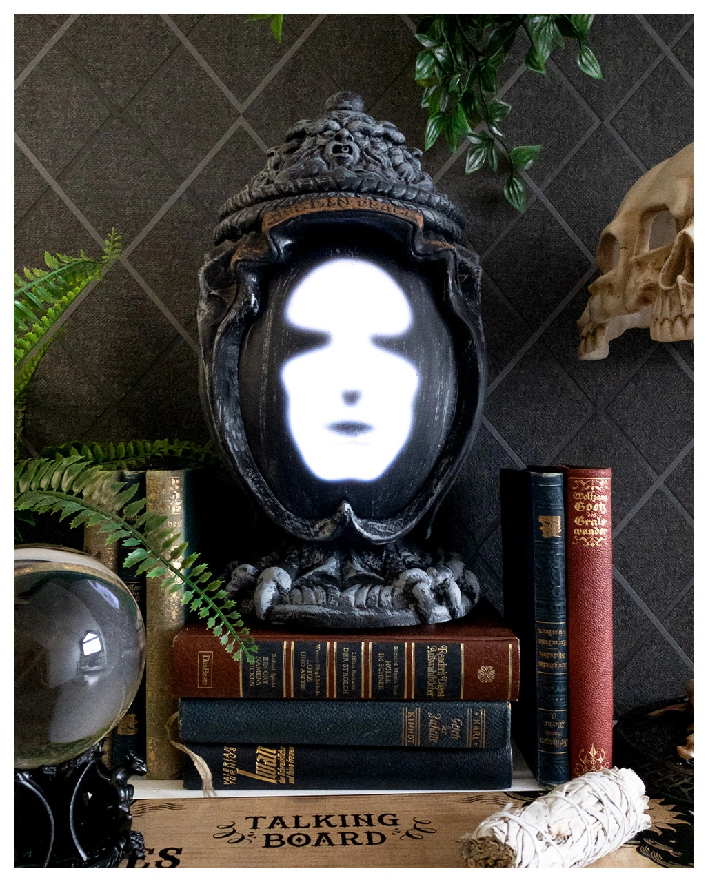 Die Geister sprechen zu dir! Mit unserer Halloween Deko Animatronic wird deine Grusel-Party zur Geisterbeschwörung. Unsere Verhexte Urne mit Light & Sound ist ein unheimlicher Party-Gag für Halloween. Die sprechende Deko Urne reagiert auf Bewegung und lehrt jedem, der ihr nahe kommt, das Fürchten. Sobald sich jemand der Urne nähert, erscheint eine beleuchtete, geisterhafte Gestalt. Der Geist redet und ist unheimlich beleuchtet.