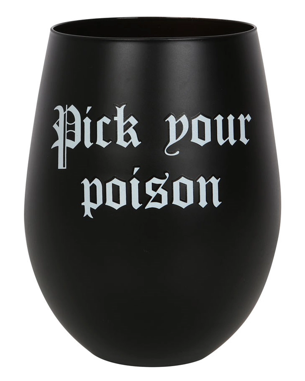 Pick your Poison! Unser schwarzes Halloween Glas mit der Aufschrift “Pick your Poison” macht sich fantastisch als Geschirr für den 31. Oktober. Es handelt sich um ein Cocktailglas ohne Stiel, das wie ein Trinkbecher aussieht. Auf der Vorderseite ist der weiße Schriftzug zu lesen. Bestelle am besten gleich mehrere dieser schönen Halloween Gläser und dekoriere wie ein echter Profi!